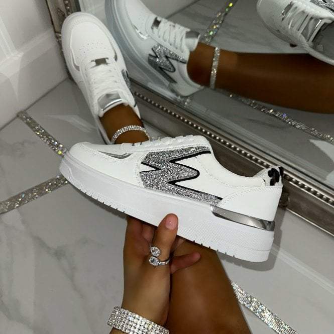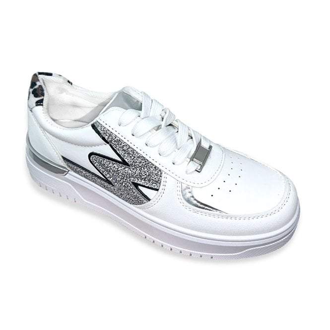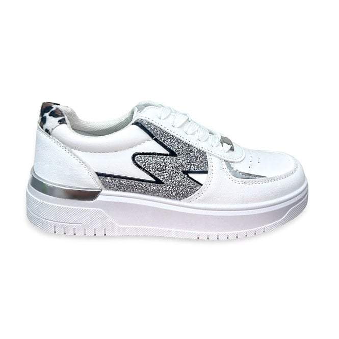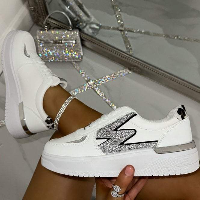 We have the perfect statement white sparkly trainers that are the ideal addition to your off-duty wardrobe. With eye-catching features with glitter outer, shiny metallic tongue and leopard print detailing, you are bound to cause shoe envy wherever you go. Featuring a durable rubber outer sole, there will be no slowing you down when it comes to high-impact activities. The soft and cushioned textile lining will continue to ensure that you feet feel on cloud nine, whilst the PVC upper will turn heads effortlessly. The perfect addition to any and every outfit!