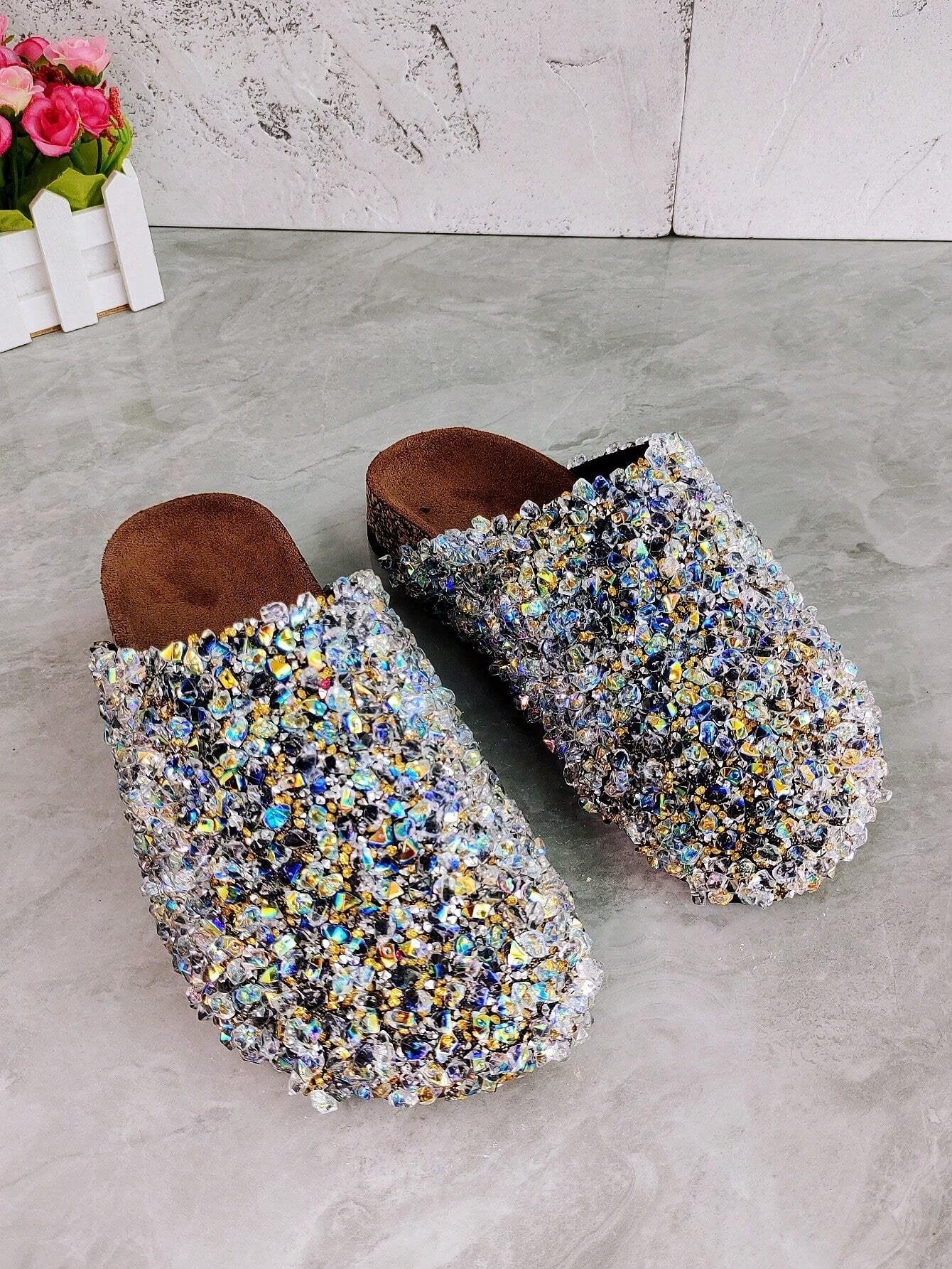 Women's Buckle Mules Slides With Rhinestone And Glitter Detailing